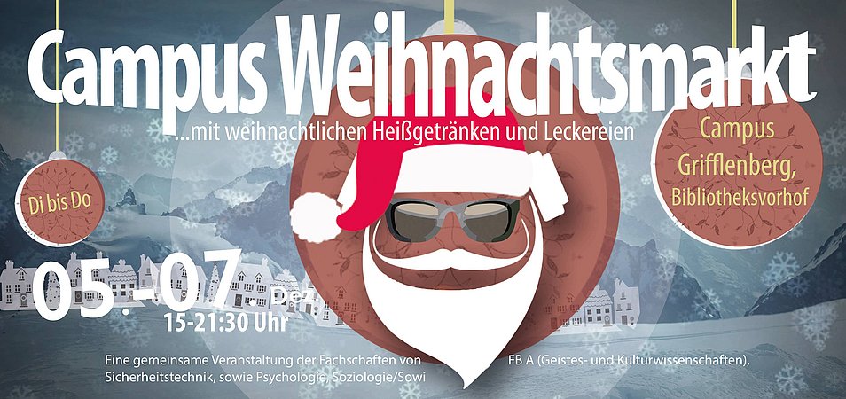 Von Dienstag bis Donnerstag (5. bis 7. Dezember) steht der Campus Weihnachtsmarkt wieder vor der Unibibliothek. Jeweils von 15 bis 21.30 Uhr gibt es dort Glühwein, Waffeln und Bratwürstchen. Das Ganze wird organisiert von den Fachschaften Sicherheitstechnik, Geistes- und Kulturwissenschaften, Psychologie und Soziologie/Sozialwissenschaften.