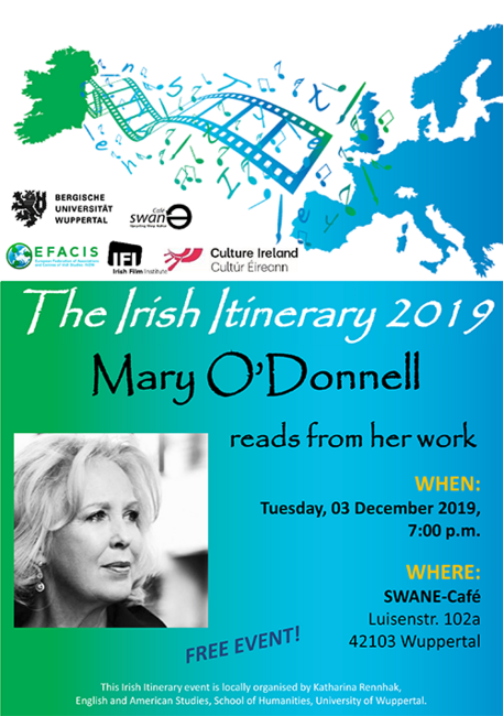 In diesem Jahr kommt die Schriftstellerin Mary O'Donnell nach Wuppertal. Sie liest am Dienstag, 3. Dezember, im SWANE-Café (Luisenstraße 102a) aus ihren Werken.