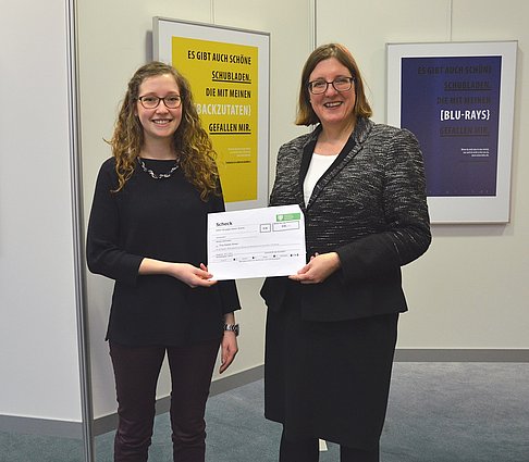 stelle, einen Scheck über 300 Euro an Studentin Daniela Brauer,