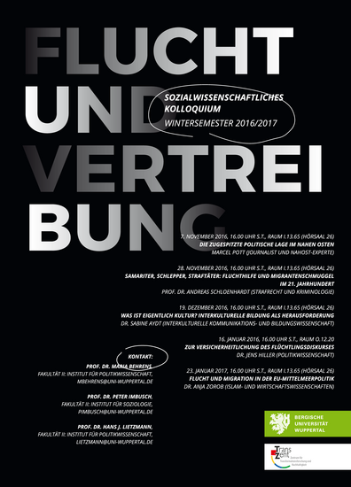 semester mit dem Thema Flucht und Vertreibung. Organisatoren sind die Politikwissenschaftler Prof. Dr. Maria Behrens und Prof. Dr. Hans Lietzmann sowie der Soziologe Prof. Dr. Peter Imbusch.