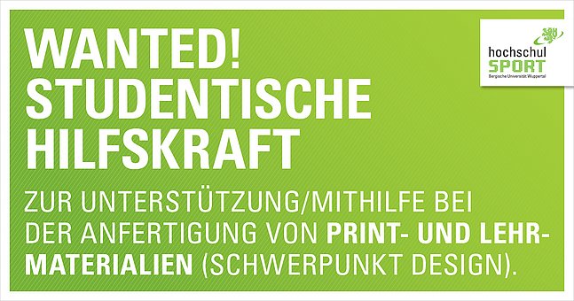 Der Hochschulsport sucht eine studentische Hilfskraft mit dem Schwerpunkt Design im Printbereich. Wer sich bewerben möchte, sollte über sehr gute Kenntnisse in allen gängigen Design-Programmen (InDesign, Photoshop und Illustrator) verfügen und ein hohes Maß an Kreativität und Flexibilität mitbringen.
